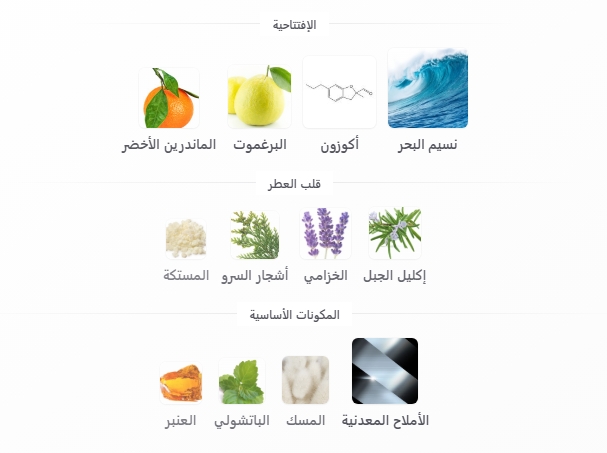 يفتتح مكوناته برائحة البحر المنعشة، تمتزج هذه الرائحة برائحة البرغموت؛ لتمنحك انتعاش مميز لا يقاوم.