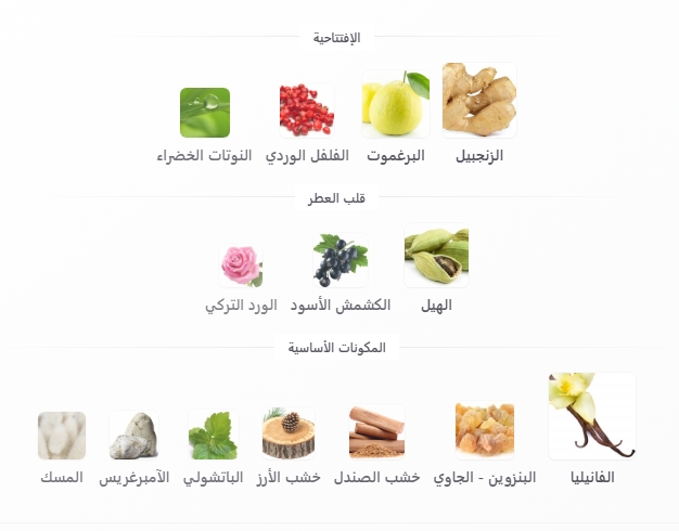 قاعدة العطر : تتكون من الفانيليا , خشب الصندل , البنزوين – الجاوي , خشب الأرز , الباتشولي , الآمبرغريس و المسك
