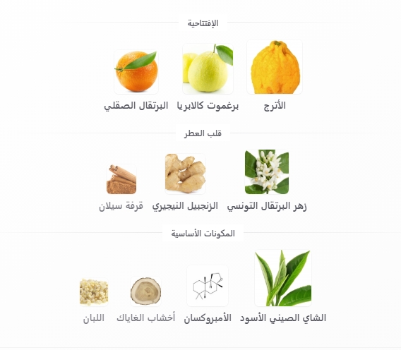 - المكونات العليا: برغموت كالابراي، زنجبيل نيجيري، قرفة سيلاني