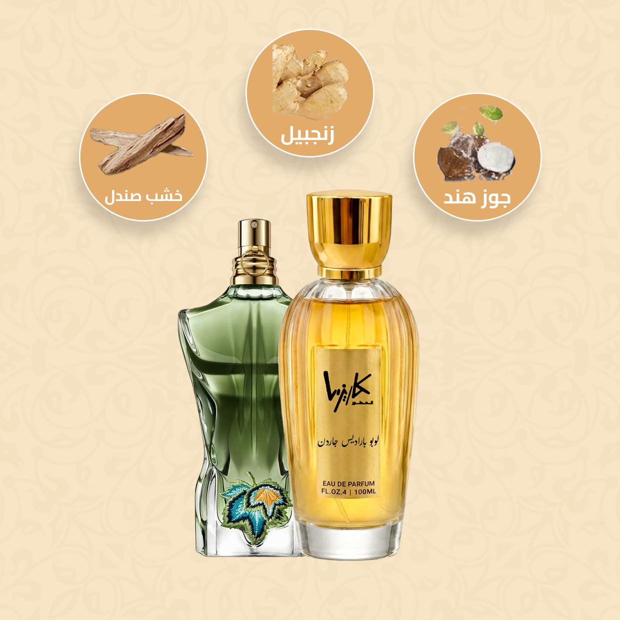 خشب الصندلعطر لي بو براديس جاردن من جان بول غوتييه، زجاج باللون الأخضر الزمردي المطرز بورقة عنب لامعة تتميز بتفاصيل الأزياء الراقية الملونة، من يستطيع مقاومة هذه الزجاجة المجردة؟ دع نفسك تأسر، زجاجة لا تنسى، يخفي التألق الاستوائي لورقة الكرمة المطرزة على طراز الأزياء الراقية الحديقة السرية التي تسكنها هذه الزجاجة العارية ذات اللون الأخضر الزمردي، قوة جذب لا تقبل المنافسة تغمرك في هذا العطر الرجولي المثير والمراوغ الذي لا يقاوم.